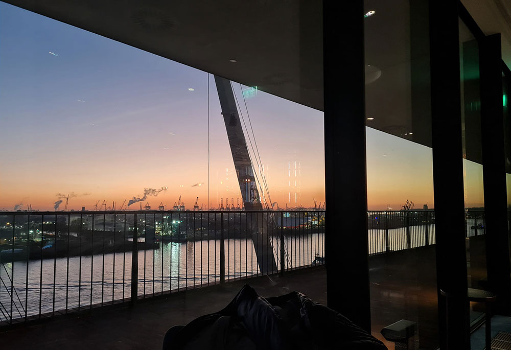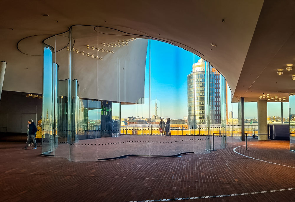 Construcția clădirii futuriste avea acest aspect în concepție: panourile de sticlă panoramice ale restaurantului Stoertebeker Beer & Dine sunt destinate să ofere vizitatorilor o vedere unică a portului Hamburg.