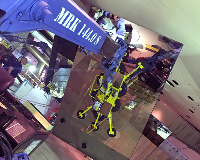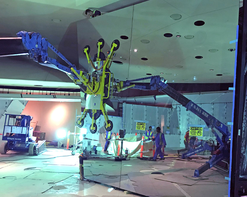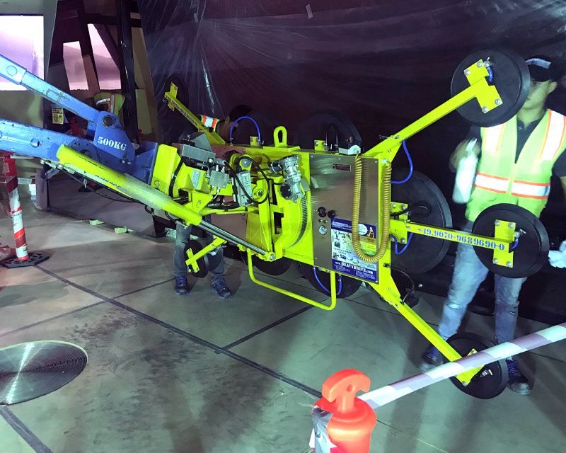 Instalația de sucțiune este prevăzută cu un manipulator de plafon cu 3 axe, cu ajutorul căruia operatorul a putut roti și ridica foarte ușor prin telecomandă radio elementele de sticlă cu dimensiuni de 3,1 x 6,0 metri în spațiul interior restrâns.